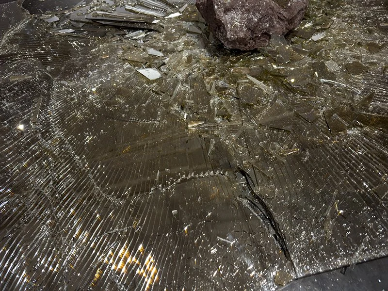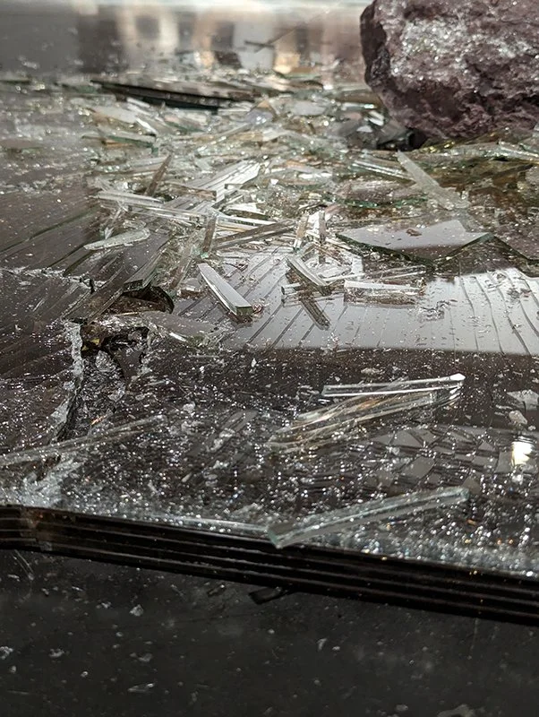 5 sheets of golden one way mirror, stone, performance (as installed)